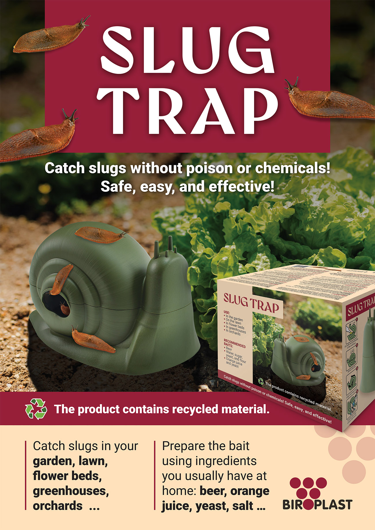 | Catch snails in your garden, lawn, flower bed, greenhouse, orchard... Prepare the bait from ingredients you usually have at home: beer, orange juice, yeast, salt... Safe, easy and effective! |